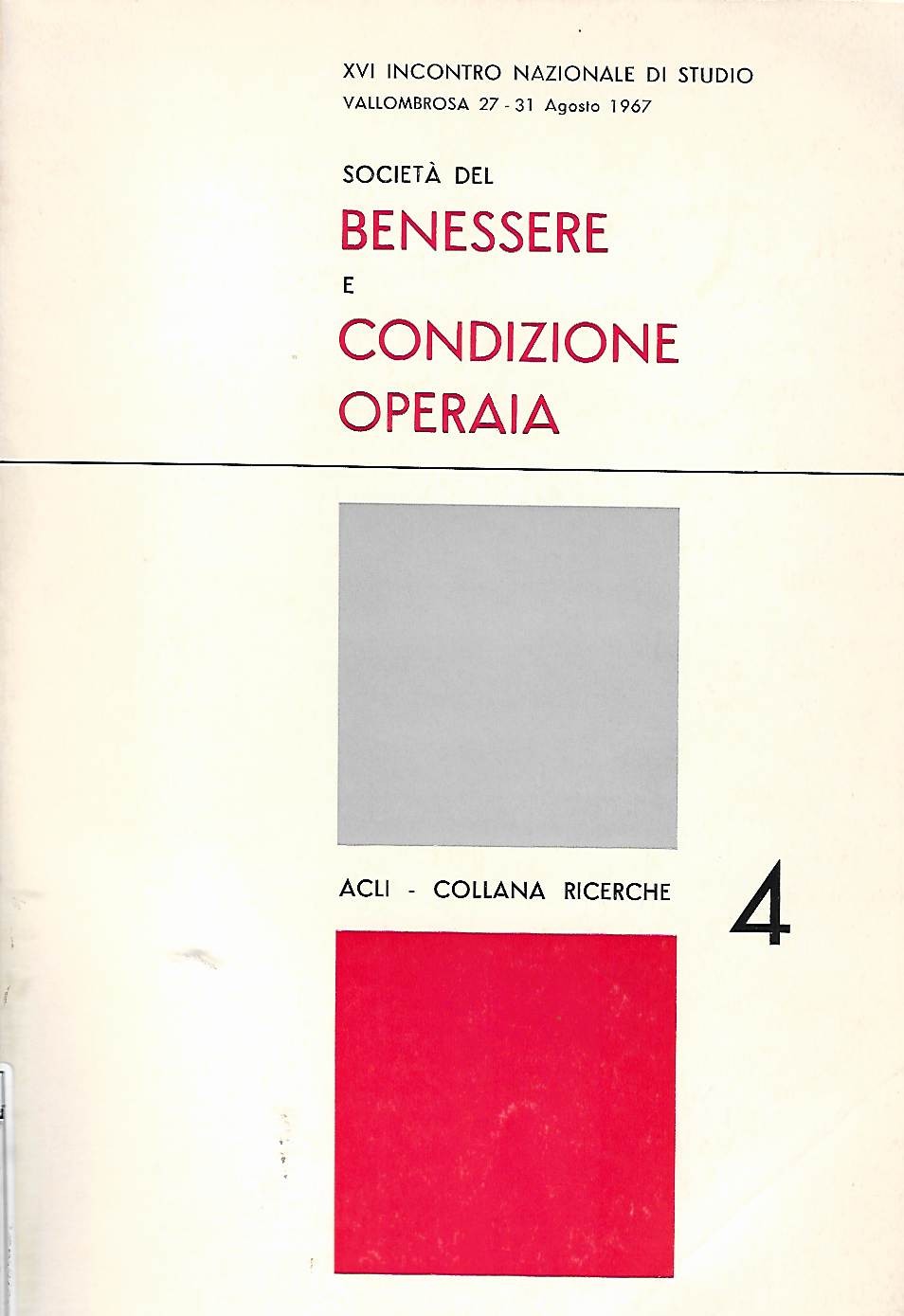 Società del benessere e condizione operaia : 16. incontro nazionale di studio, Vallombrosa 27-31 agosto 1967Pubblicazione[Roma] : ACLI, 1968 (Roma : I.G.M.)Descrizione fisica414 p. ; 24 cm.SoggettiSocietà - Sec. 20.Lavoratori - Condizioni economiche e socialiClassificazione Dewey301 (16.) SOCIOLOGIA RELAZIONI UMANE301 (17.) SOCIOLOGIA Ricerca Tematica: LAVORO SOCIOLOGIA N° inventario: 5809 BID code: SBL0076219 Collocazione: CA25C Sala: Salvarani (storia, biografie)RICHIESTA INFORMAZIONI CONDIVIDI SU