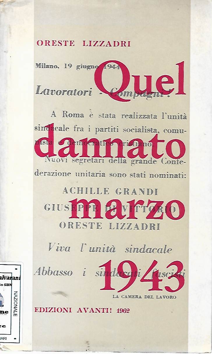 Quel dannato marzo 1943 / Oreste LizzadriPubblicazioneMilano : Edizioni Avanti!, 1962Descrizione fisica128 p., [4] c. di tav. : ill. ; 21 cmSoggettiSindacati - Italia - 1943-1961Movimento operaio - Italia - 1943-1961Classificazione Dewey331.88 (16.) MOVIMENTO OPERAIO SINDACATI Ricerca Tematica: MOVIMENTO OPERAIO LAVORO SINDACATO SOCIALISMO N° inventario: 5895 BID code: IEI0019007 Collocazione: CA9D Sala: Salvarani (storia, biografie)RICHIESTA INFORMAZIONI CONDIVIDI SU