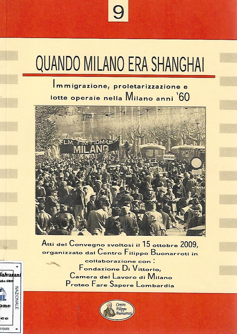 Quando Milano era Shanghai: proletarizzazione, immigrazione e lotte operaie nella Milano degli anni ’60 : atti del Convegno svoltosi alla Camera del lavoro di Milano il 15 ottobre 2009, organizzato dal Centro Filippo Buonarroti in collaborazione con la Fondazione Di Vittorio ... [et al.] / a cura del Centro Filippo BuonarrotiPubblicazioneMilano : Centro Filippo Buonarroti, stampa 2010Descrizione fisica115 p. ; 22 cmNote generaliPrima del tit.: Ottobre 2010 : 1969-2009: a quarant’anni dall’autunno caldo.SoggettiMovimento operaio - Milano - 1960-1969 - Congressi - 2009Classificazione Dewey331.89094521 (20.) Economia del lavoro. Contrattazione e controversie collettive. Provincia di Milano e provincia di Lodi. Ricerca Tematica: MOVIMENTO OPERAIO CONGRESSI SINDACATO LAVORO ATTI N° inventario: 5911 BID code: LO11334337 Collocazione: CA25D Sala: Salvarani (storia, biografie)RICHIESTA INFORMAZIONI CONDIVIDI SU